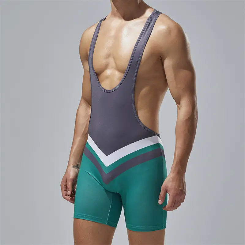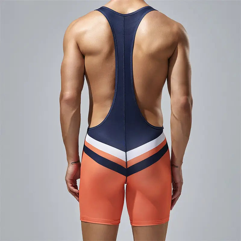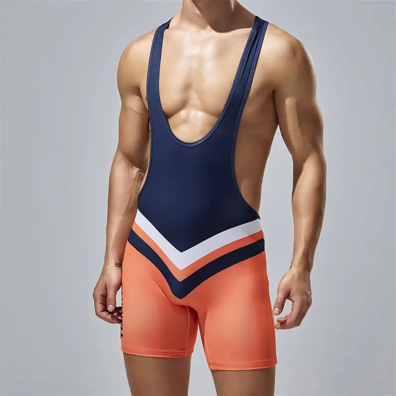 Elevate your workout with the TAUWELL Men's Stretchy Bodysuit, designed for versatility and performance. Crafted from 88% Polyester and 12% Spandex, this bodysuit offers exceptional elasticity and comfort. The deep blue upper features wide straps and a low-cut design, showcasing your physique, while the vibrant orange lower half with white and dark blue chevron stripes adds a dynamic flair. Perfect for wrestling, fitness training, or casual wear, this bodysuit combines style and functionality for the modern man.