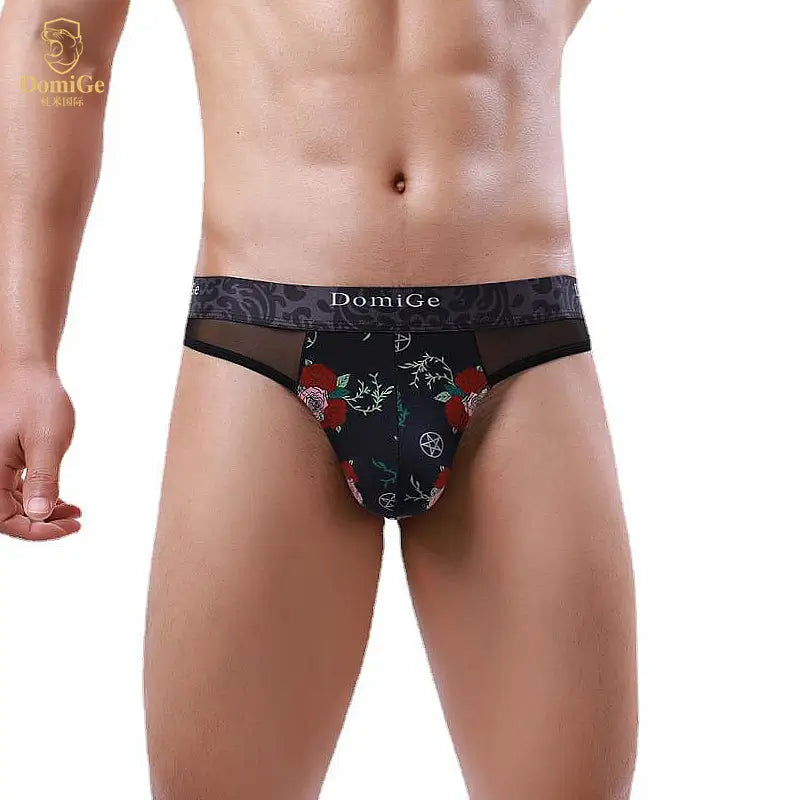 Experience luxurious comfort and cutting-edge style with DomiGe Men's Thongs. The pouch is crafted from 95% Modal and 5% Spandex, while the rest features 88% Nylon and 12% Spandex. The 3.5CM black waistband is adorned with subtle floral patterns and an elegant logo. Designed with a bulge-enhancing front that seamlessly transitions through the center and connects to the back, these thongs also feature sexy black mesh sides for added breathability. Perfect for men seeking both fashion and function in their underwear.