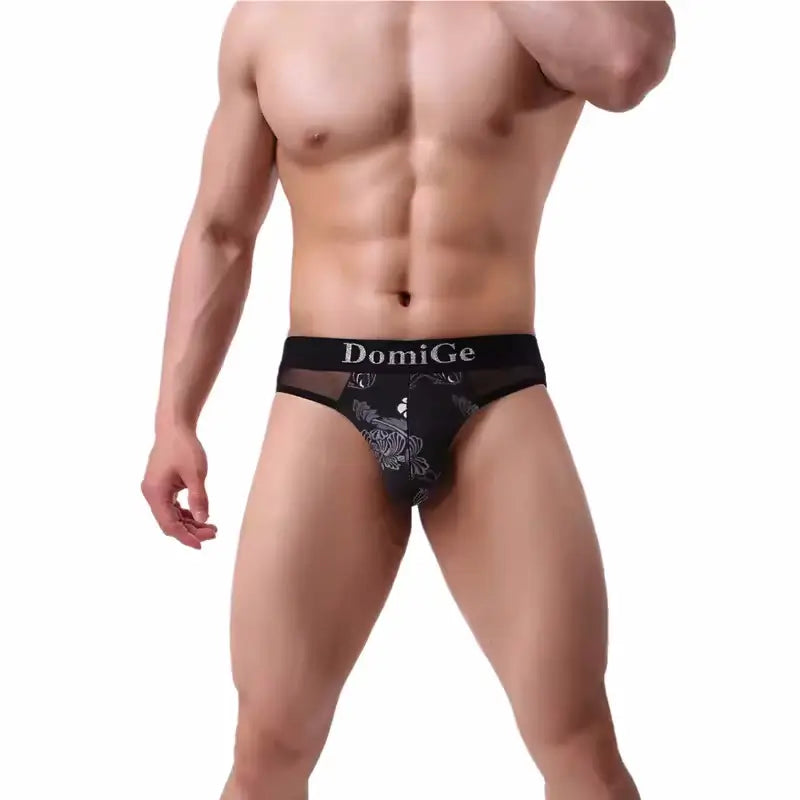 Discover the ultimate blend of style, comfort, and functionality with DomiGe Men's Sheer Mesh Underwear. Crafted from a distinctive fabric composition of 88% nylon and 12% spandex, these black print briefs offer a sleek and sexy look. The 3.5CM wide black waistband features a striking silver logo, while the front pouch design provides ample support and a flattering fit. The 95% cotton and 5% spandex crotch area ensures maximum breathability and comfort. Double-sided black mesh panels add a touch of sensuality, making these briefs perfect for any occasion.